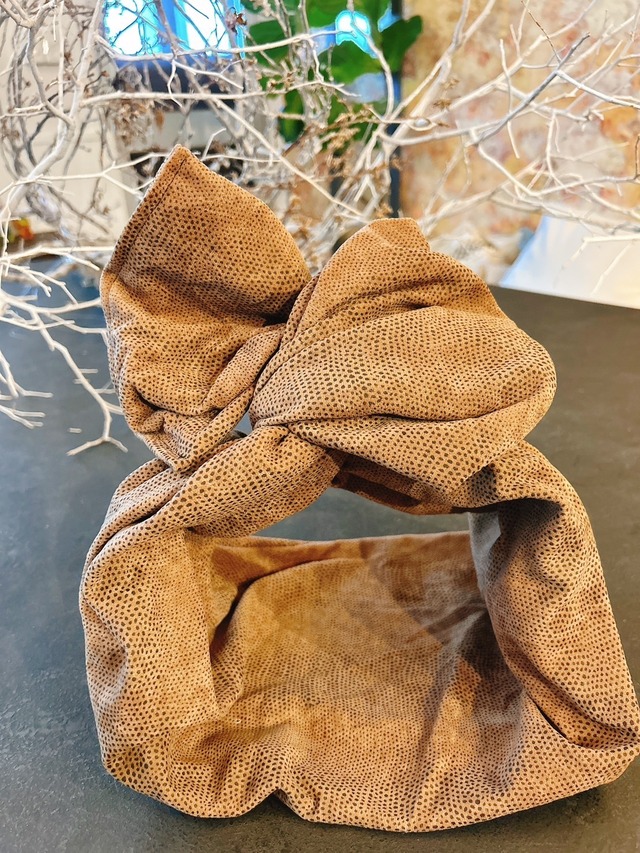 【旅するターバン】Chubby(幅広タイプ)|フェイクレザー|スモーキーブラウン|スネーク柄|レディース|メンズ スモーキーブラウンのフェイクレザーがデザインされた、しなやかなスネーク柄のターバンです。大人の魅力を引き立てるクールな印象で、オシャレなアクセントとして楽しめる一品。シーズンを問わずご使用いただけ、コーディネートの幅を広げてくれます。 _________________________ ワイヤー入りのデザインにより、お好きなスタイルに自由に変化させることが可能です。フィット感にも優れており、着心地は楽で、長時間の着用でも快適さを保ちます。さりげなくおしゃれを楽しむのにぴったりのターバンです。 _________________________ サイズ ・レギュラー 【 幅 約13〜20cm/ 長さ 約95~110 cm】 ・Chubby(レギュラーサイズより幅広タイプ) 【 幅 約20~35cm/長さ 約100~111cm】 ・Rim shot(レギュラーサイズの長さ約2倍タイプ) 【 幅 約13〜20cm/長さ 約190~215cm】 _________________________ 《お手入れ》 ・ワイヤー:ご使用のたびにワイヤーの形を整えておくと扱いやすくなります。 ・洗濯について:ファブリックウォーターや優しく手洗いがおすすめです。洗濯機でのお洗濯はワイヤーが絡まりやすいのでご注意ください。 《注意事項》 ・ひとつひとつ手作業で制作してるオリジナルデザインとなっています。柄の配置や生地の状態、サイズ感等個々に多少の差が生じることがございます。 ・ お使いの端末や閲覧環境により、色味や質感が多少異なって見えることがございます。 ・実店舗での販売のタイミングによっては商品在庫切れにより、注文キャンセルとさせていただく恐れもございます。 ・イメージ違い等、お客さまご都合による交換・返品はご遠慮頂いております。 ・ラッピング対応は致しかねますのでご了承ください。